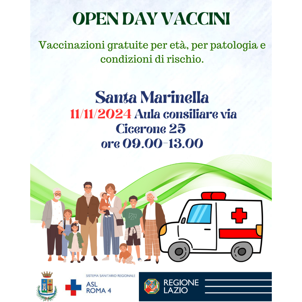 Si informa l'utenza che lunedì 11 novembre 2024 dalle ore 9 alle ore 13 l'equipe del Servizio Vaccinale della Asl Roma 4 sarà presente all'aula consigliare di via Cicerone 25 a Santa Marinella, per offrire alla popolazione i vaccini antinfluenzale e antipneumococcico e tutti quelli raccomandati per fascia d'età, patologia e fattori di rischio.